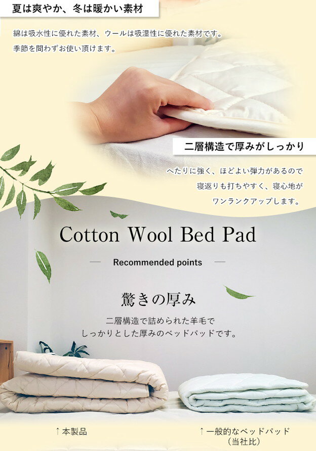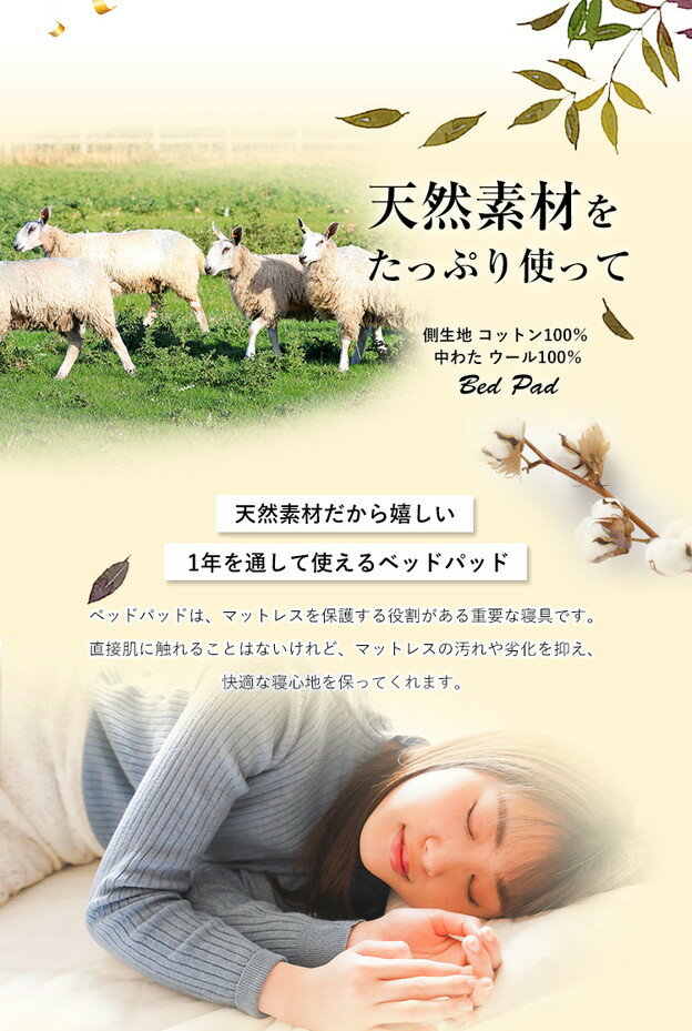 ベッドパッド シングルサイズ100cm×200cm 日本製 オールシーズン 側生地/綿100% 詰め物/ウール100% (NNY-2015) 二層式羊毛ベッドパッド 敷きパッド 敷きパット ベットパッド 新生活 車中泊 寝具 旅行用 客用 子ども ナセル